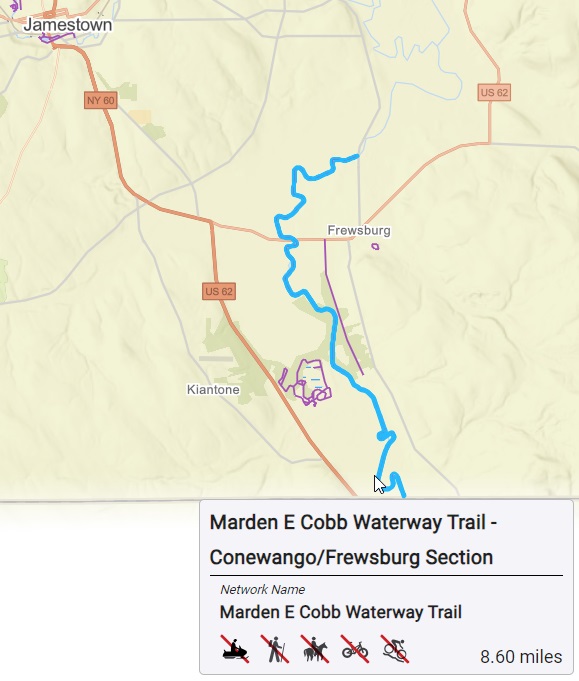 Chautauqua Lake becomes a linear waterbody in the city of Jamestown, and we call it the Chadakoin River from that point on. The Chadakoin River joins Cassadaga Creek just north of Falconer and adds Chautauqua Lake’s water to the drainage coming out of both Bear Lake and the Cassadaga Lakes. About 9.5 miles downstream from there, Cassadaga Creek meets Conewango Creek, which enters from Cattaraugus County near the hamlet of Kennedy, and flows south into Pennsylvania near Route 62 to eventually meet the Allegheny River in Warren. In all, the county’s major waterways (Cassadaga and Conewango Creeks) provide over 50 miles of recreational potential. The southern section of the Conewango carries the combined outflow of several lakes and offers bigger water than the narrower sections that are found closer to their respective sources. All provide great opportunities for fishing and nature enjoyment from a kayak, canoe, or paddleboard – even a small (inflatable) boat with an electric trawling motor may work in areas of bigger water – but note that none of the launches support boat trailers.