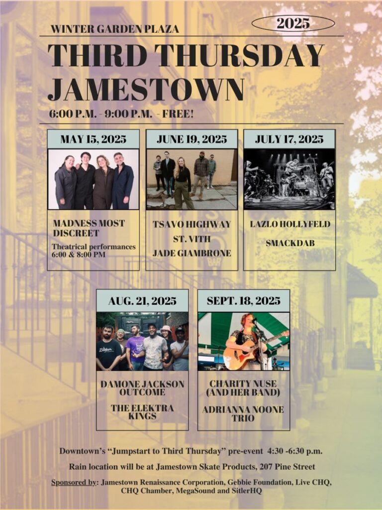 Third Thursday Jamestown is made possible by Jamestown Renaissance Corporation, Gebbie Foundation, Live CHQ, MegaSound, and SitlerHQ.