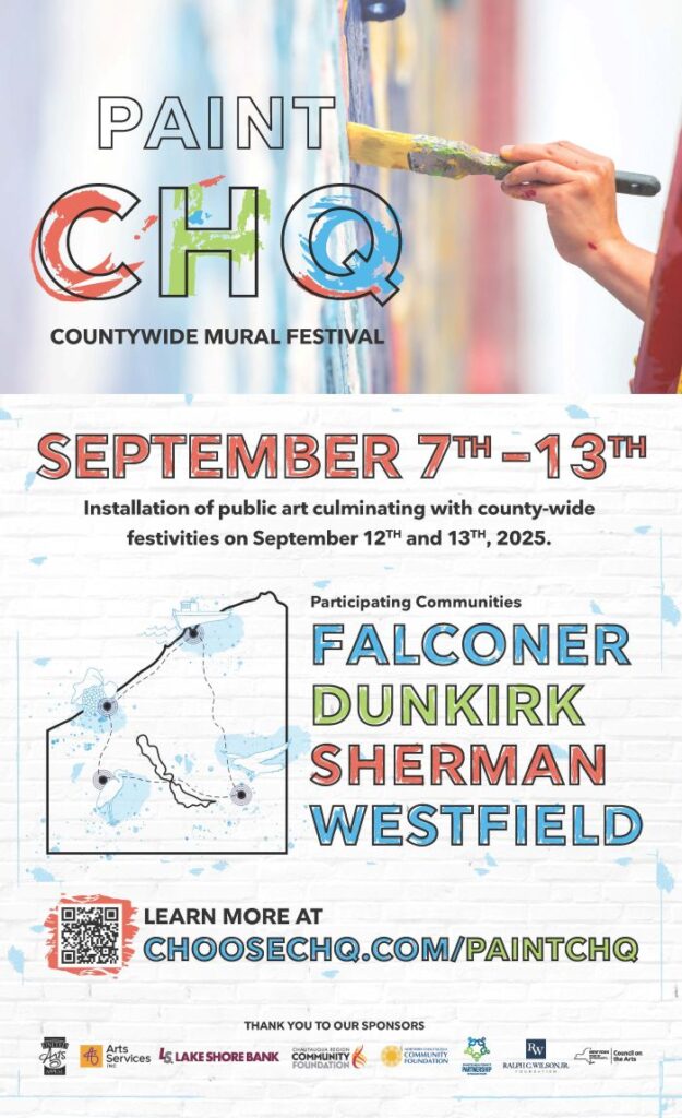 The muralists will begin work in late August, and all four murals will be completed by September 13. The public is encouraged to visit the participating communities during the mural installation process. The Paint CHQ mural festival celebrations kick off on Friday, Sept. 12 at 5 p.m. in Westfield, with other community events in Dunkirk, Falconer, and Sherman continuing all day on Saturday, Sept. 13.
